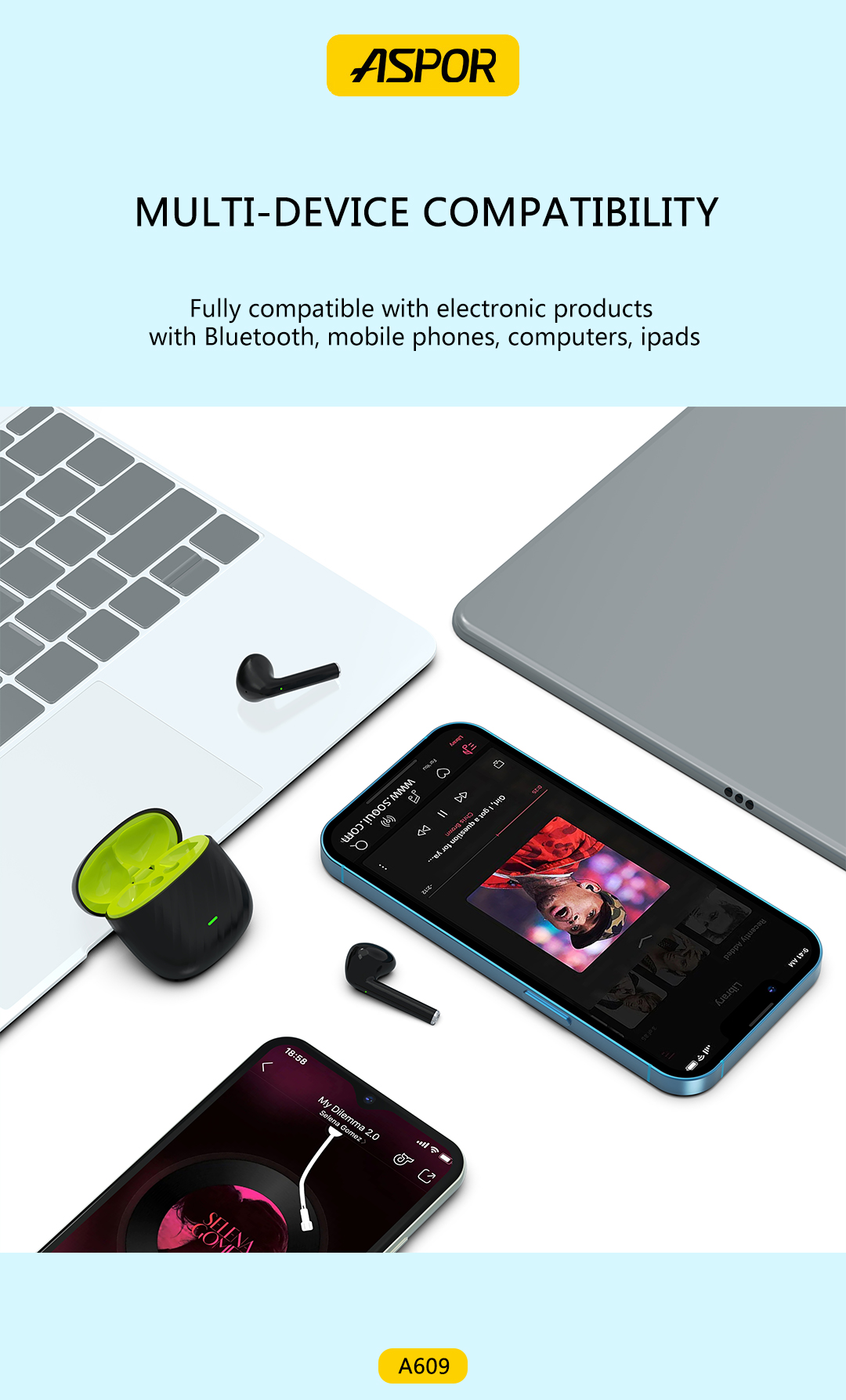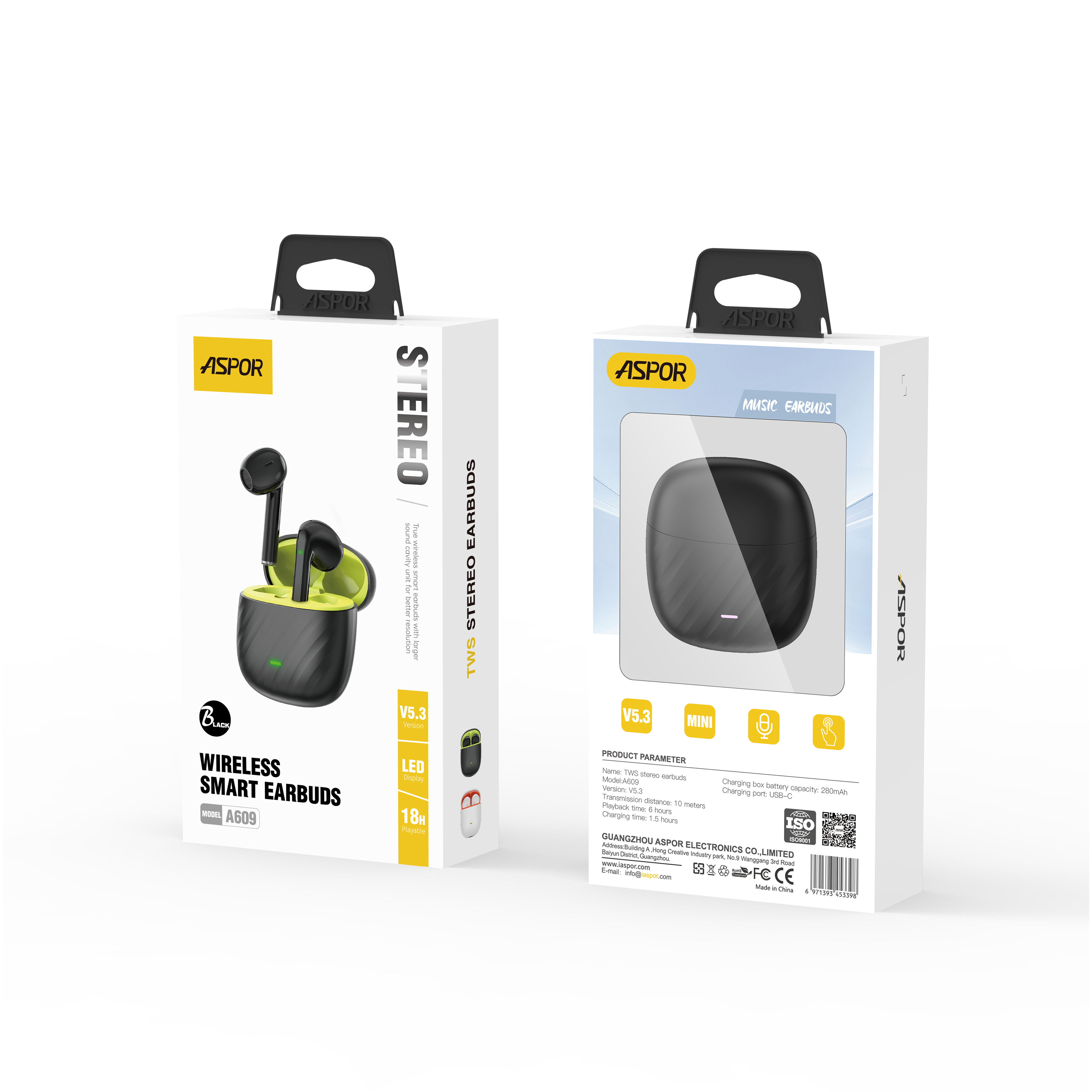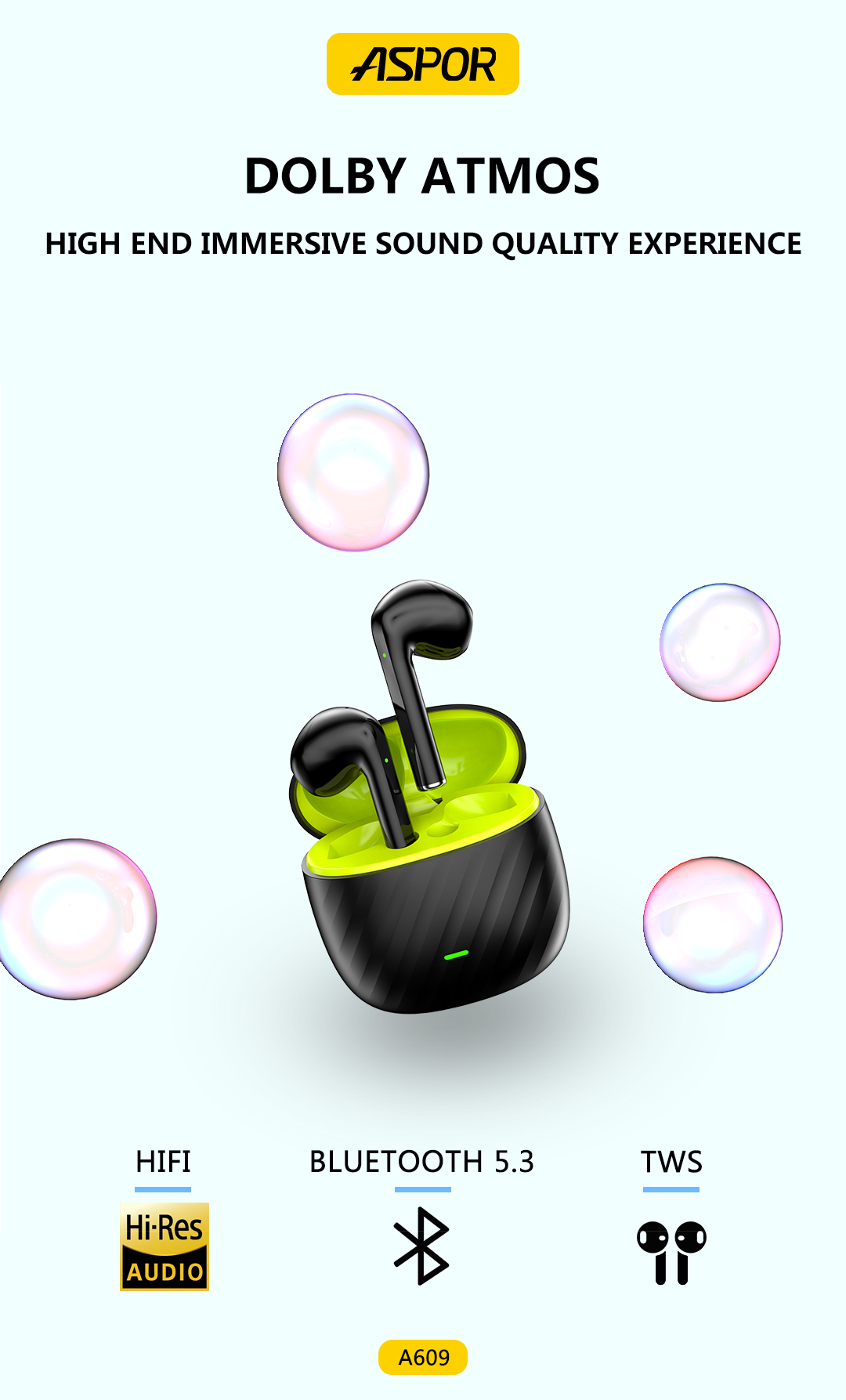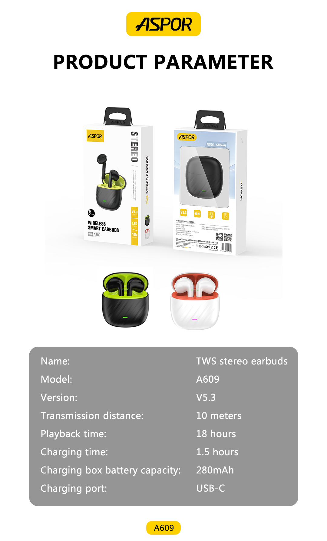 产品简介:Model:A609 版本:V5.3 传输距离:10M 播放时间:18 hours 充电时间:1.5 hours 充电盒电池容量:280mAh 充电端口:USB-C