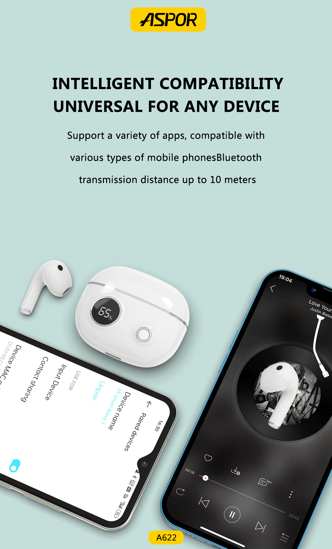 产品简介:Model:A622 版本:V5.3 传输距离:10M 播放时间:20hours 充电时间:1.5hours 充电盒电池容量:280mAh 充电端口:USB-C