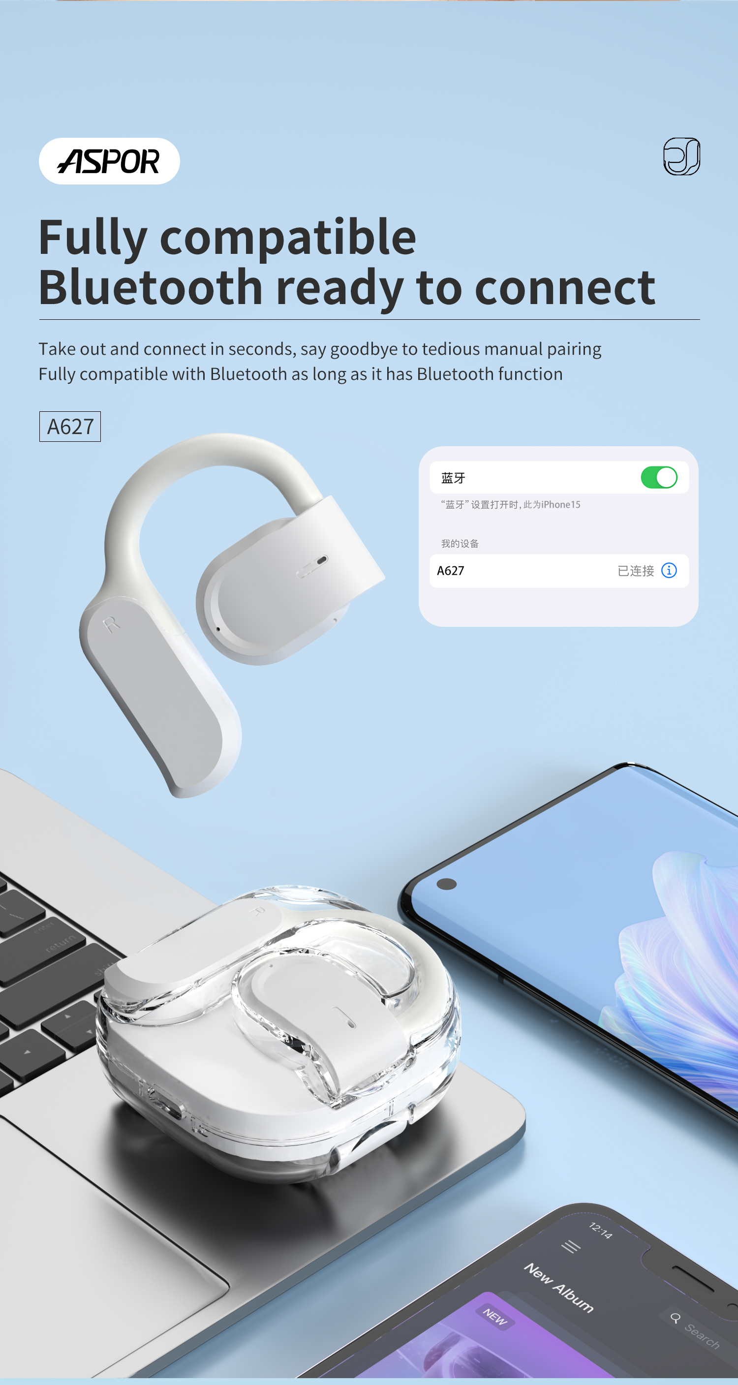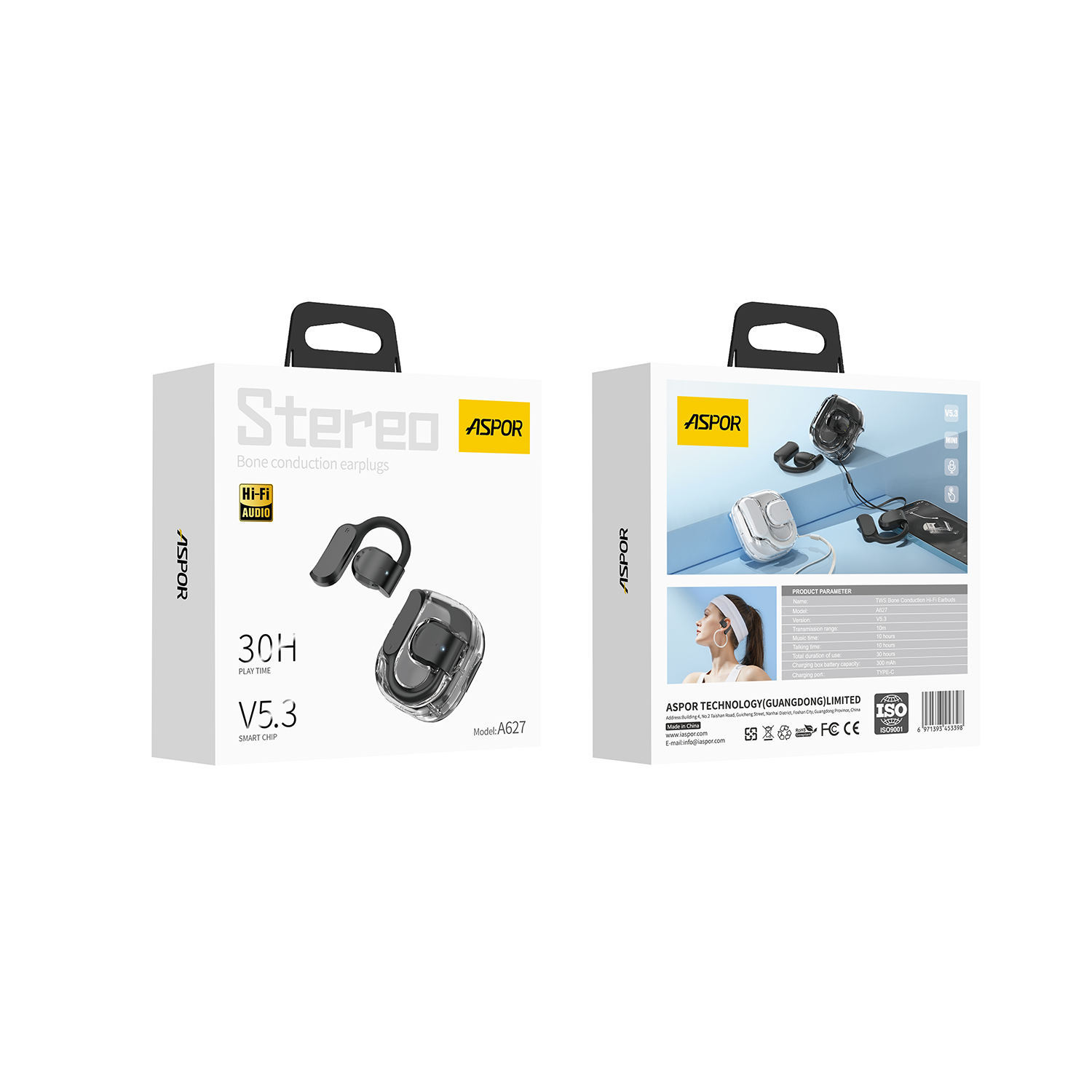 产品简介:Model: A627 版本:V5.3 传输距离:10M 通话时间:10 hours 充电盒电池容量:300mAh 充电端口:TYPE-C IPX version: 防汗 颜色:黑 / 白