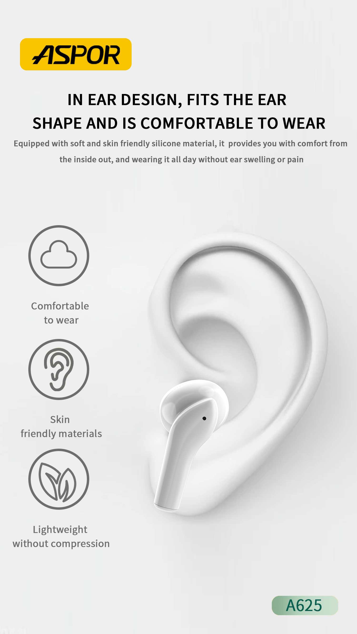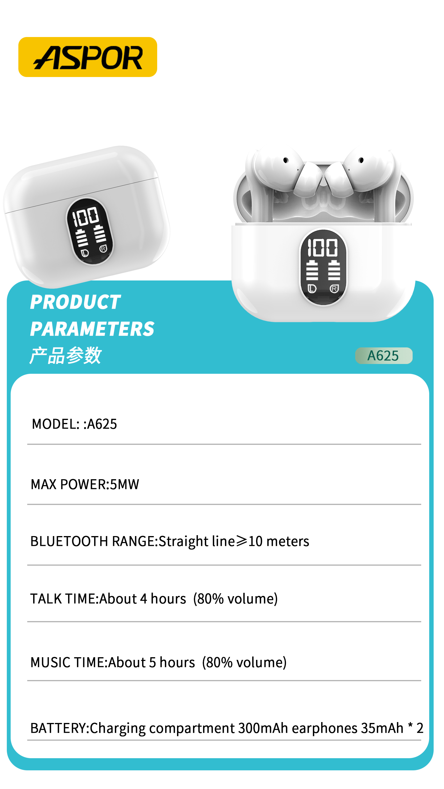 产品简介:Model:A625 最大功率:5MW 蓝牙范围:10M 演讲时间:4 hours 音乐时间:5 hours 充电盒电池容量:300mAh