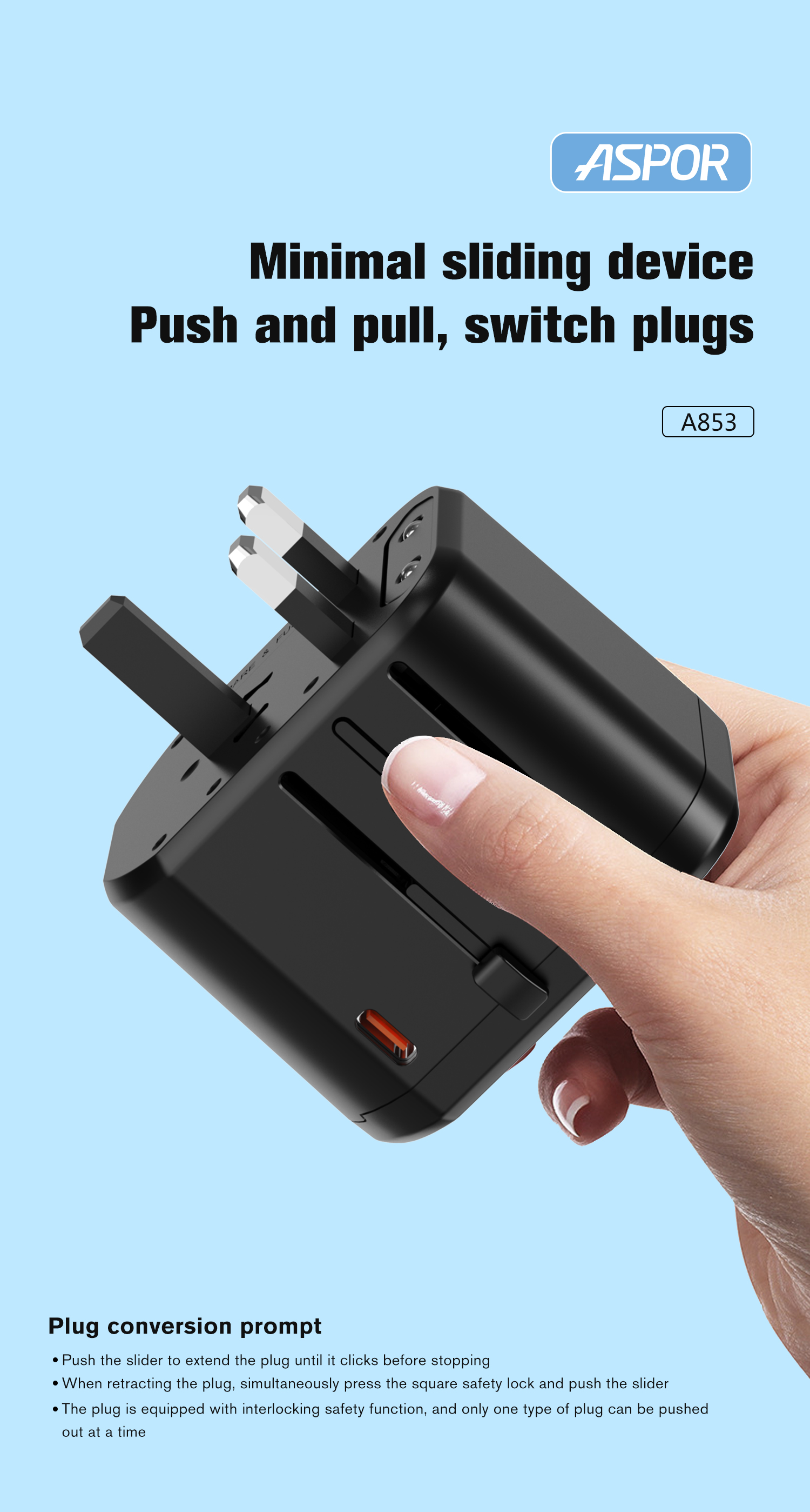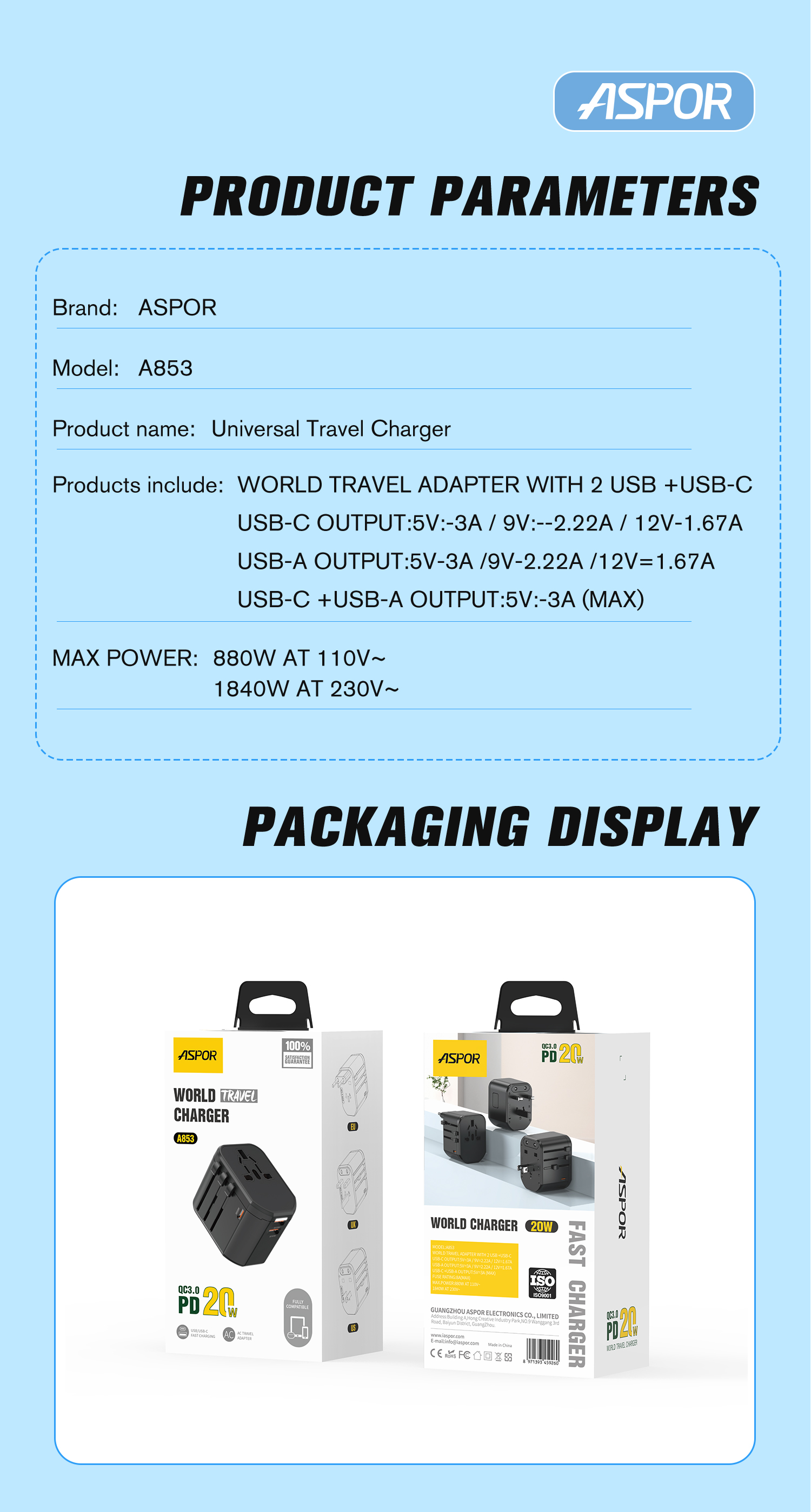 产品简介:Model:A853 USB-C 输出:5V=3A / 9V=2.22A / 12V=1.67A USB-A 输出:5V=3A / 9V=2.22A / 12V=1.67A USB-C +USB-A 输出:5V=3A(MAX) 最大功率:880W AT 110V-1840W AT 230-