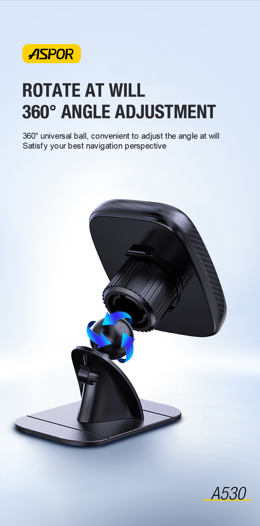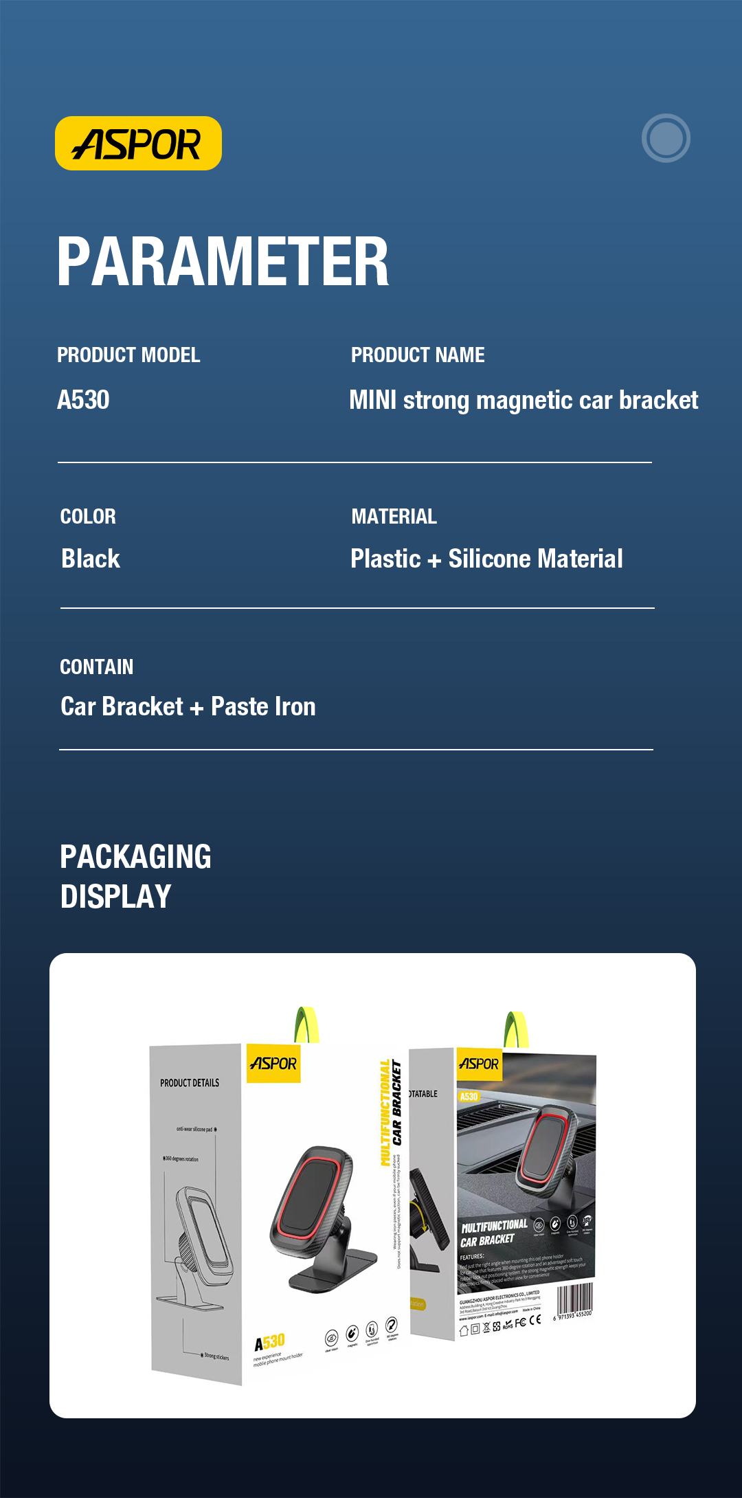 产品简介:Model: A530 Color: Black Material: Plastic+Silicone Material Contain: Car Bracket + Paste lron