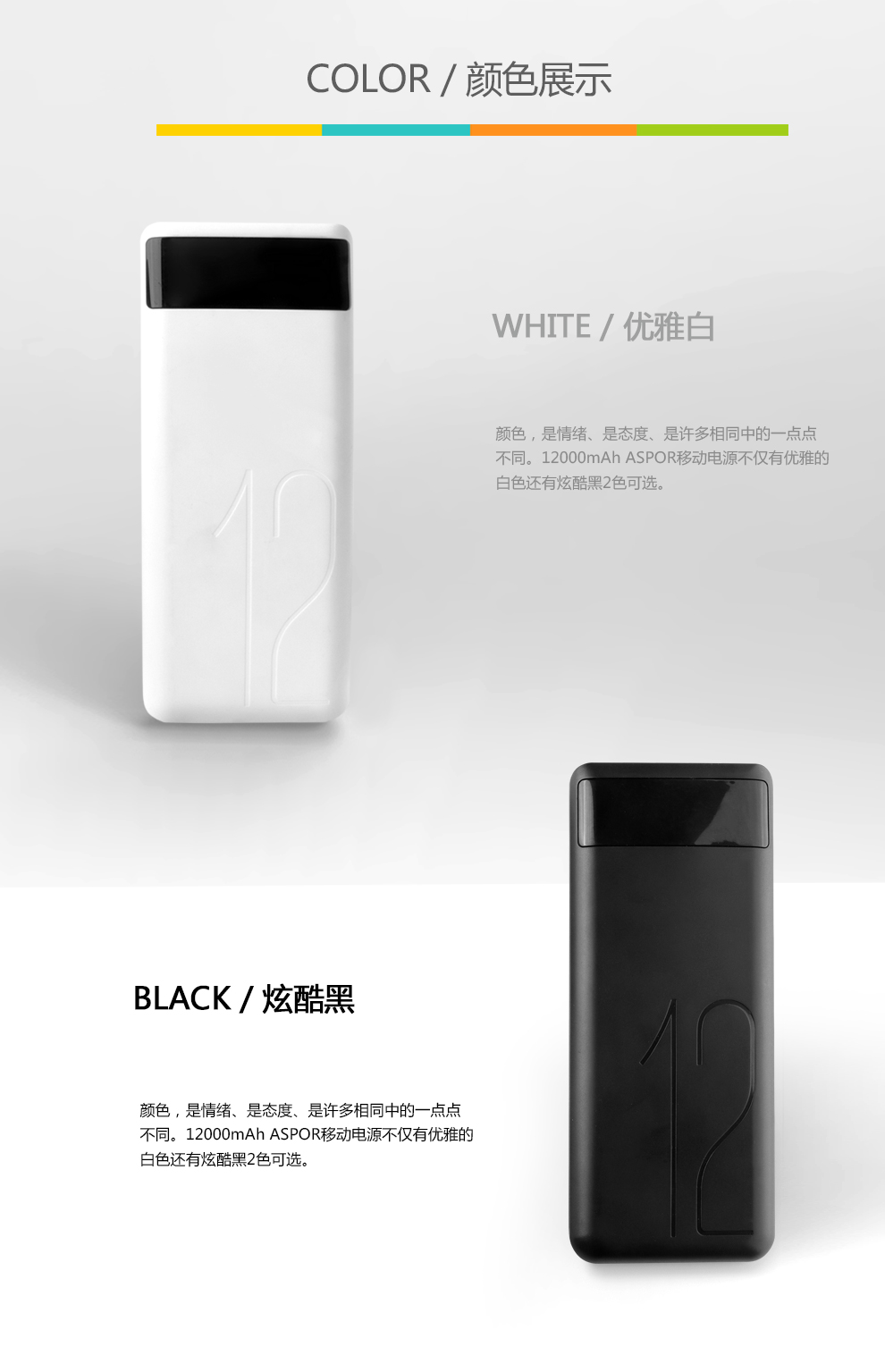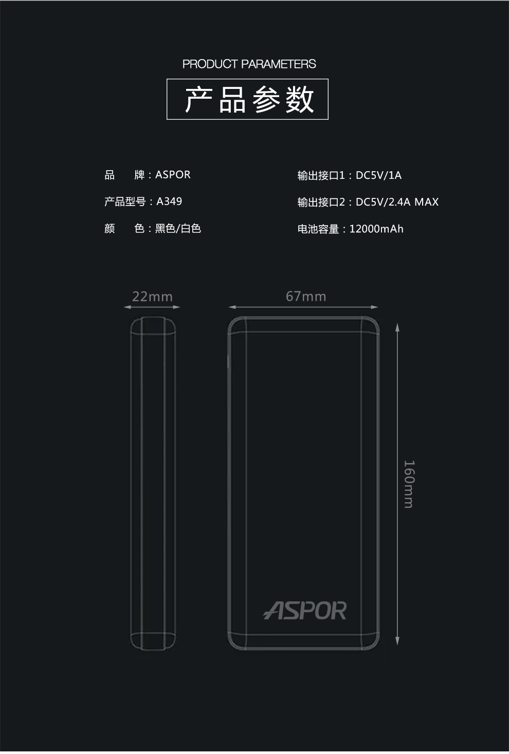 产品简介:Model:A349 Capacity:12000mAh/44.4Wh Input:DC5V-2.0A(OVP) Output1: Total DC 5V-2.4A Output2: Total DC 5V-1.0A
