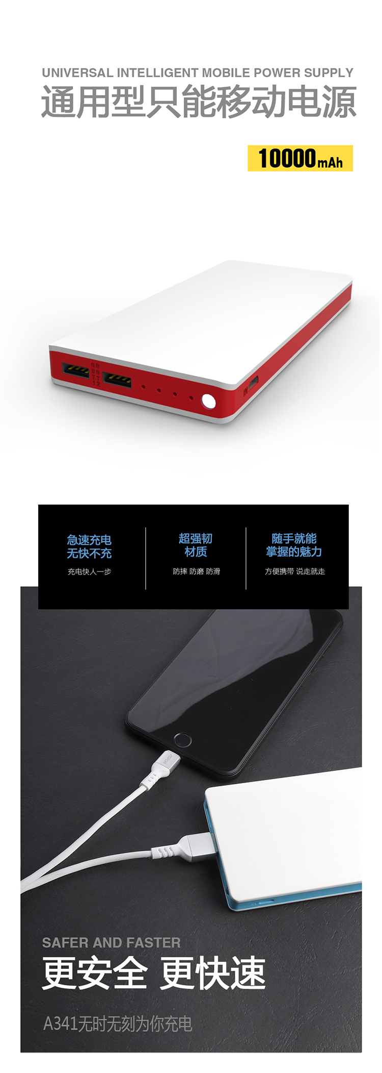 Product introduction:Model:A341 Capacity:10000mAh/37Wh Input:DC 5V-2.0A OVP Output :Total DC 5V-2.4A