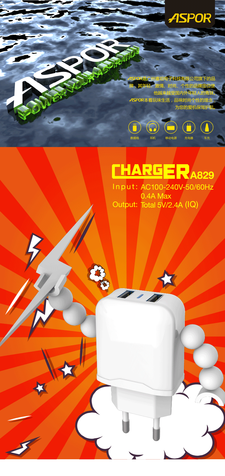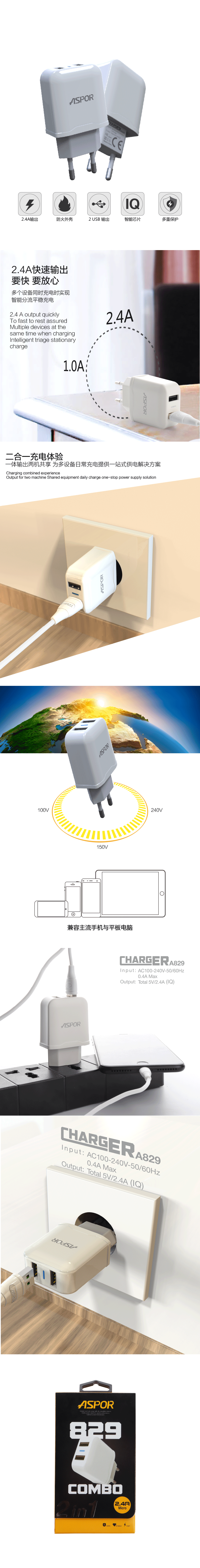 产品简介:Input:AC 100/240V 50-60HZ 0.4AMAX | Output:Total DC 5V-2.4A(IQ)
