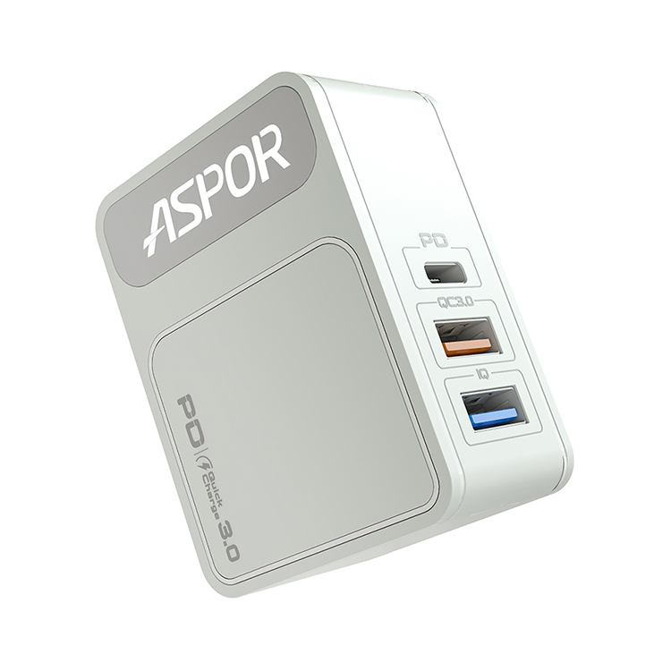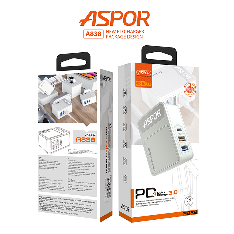 产品简介:品名/name:快充充电器 型号/model:A838 输入/input:AC 100-240V 50/60Hz 0.8A 输出/output:DC 5V/3.0A | 9V/2.0A | 12V/1.5A (PD) DC 5V/3.0A | 9V/2.0A | OC 12V/1.5A (QC) DC 5V/2.4A (IQ)