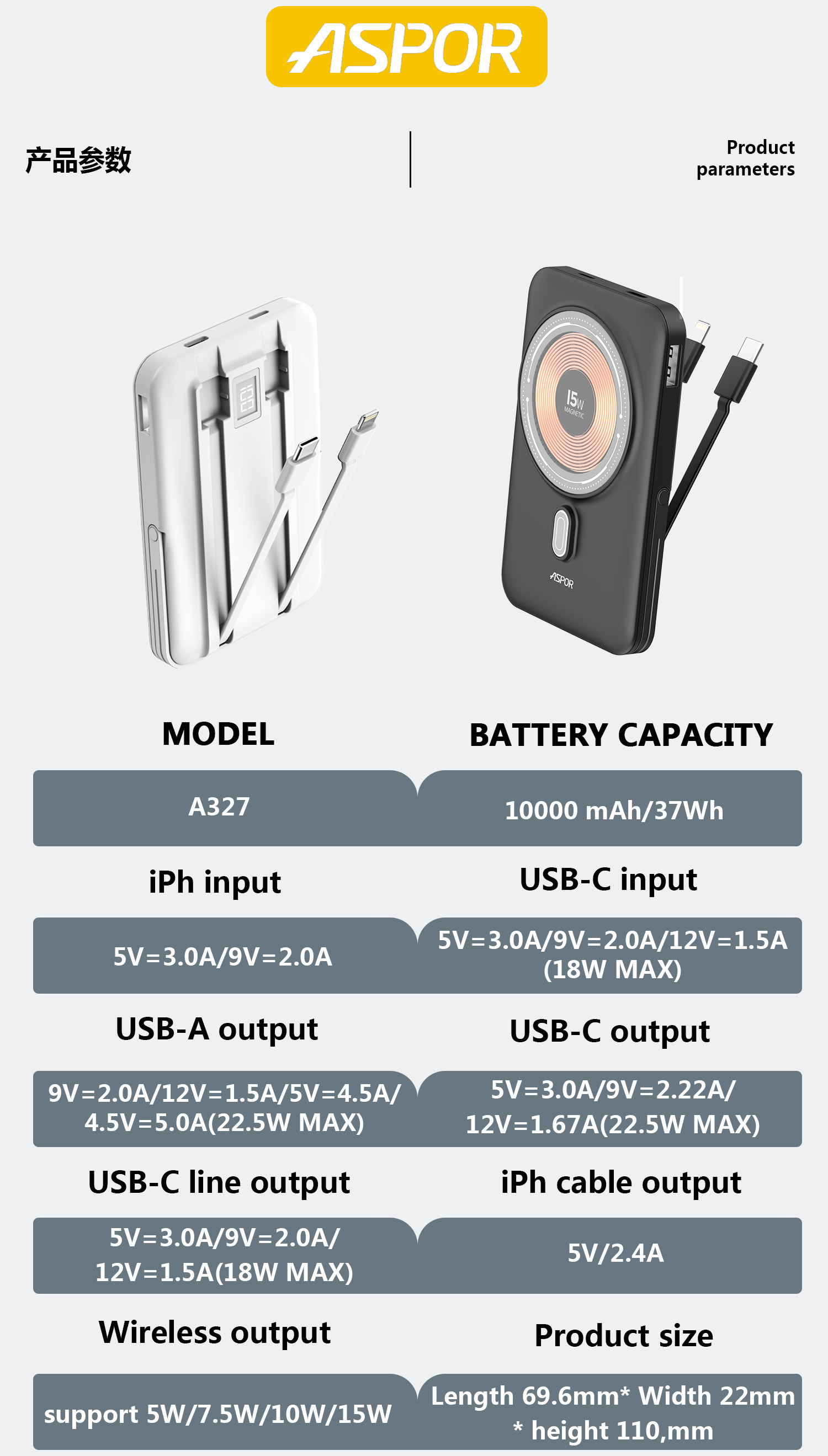 USB-A 输出:9V/2.0A 12V/1.5A 5V/4.5A 4.5V/5.0A(22.5W MAX)