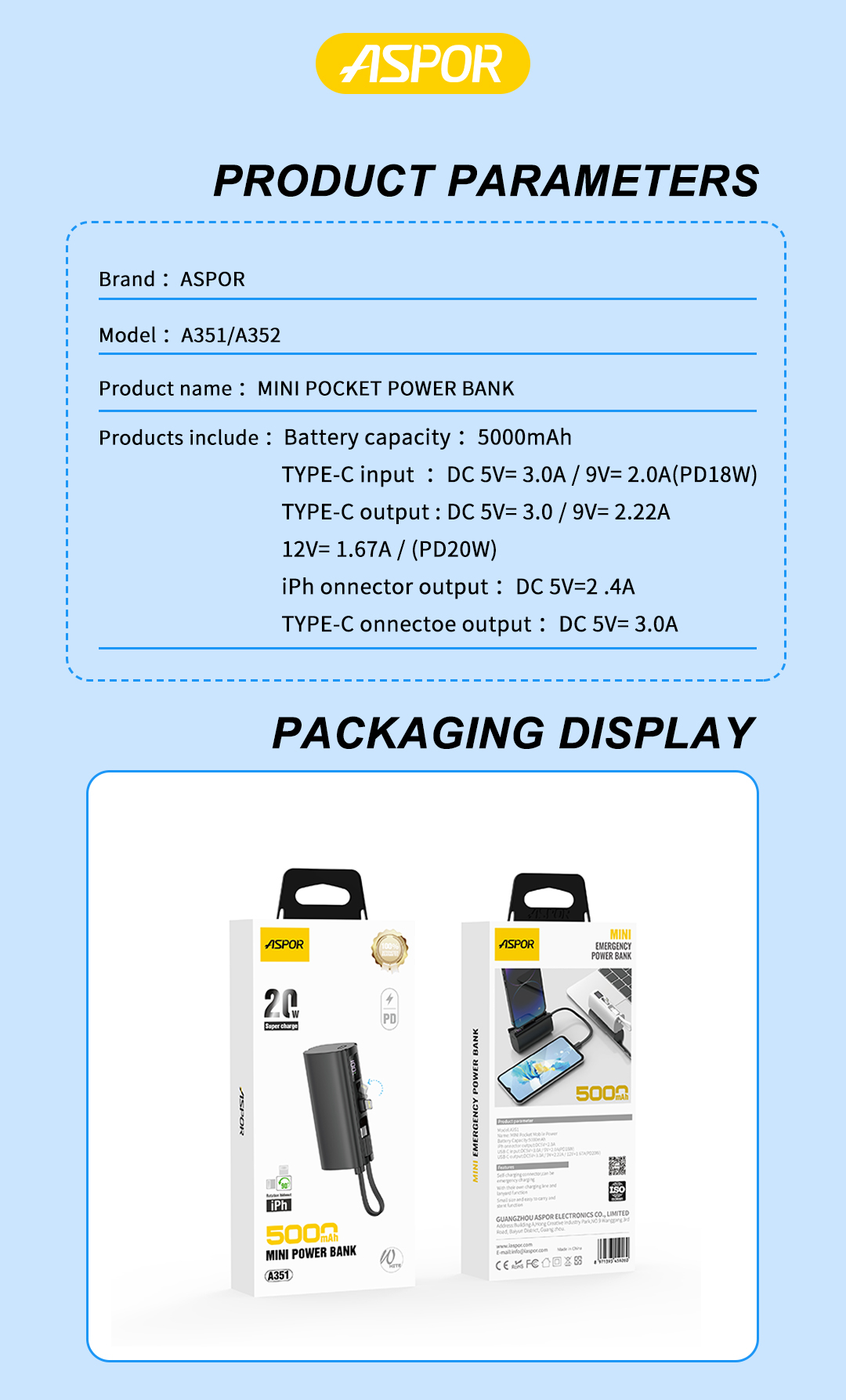 产品简介:Model:A351 容量:5000mAh 颜色:黑 / 白 USB-C 输入:DC 5V/3.0A 9V/2.0A(PD18W) USB-C 输出:DC 5V/3.0A 9V/2.22A 12V/1.67A(PD20W) iPh接口输出:DC 5V/2.0A TYPE-C接口输出:DC 5V/3.0A