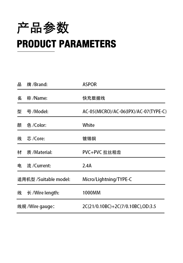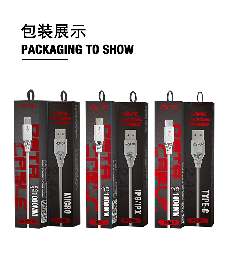 产品简介:Model:AC-05(Micro)/AC-06(iPh)/AC-07(TYPE-C) Wire length:1000MM 电流:2.4A