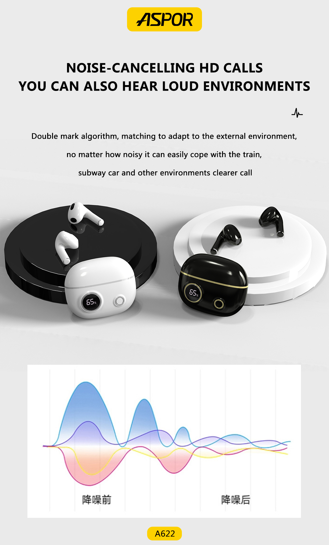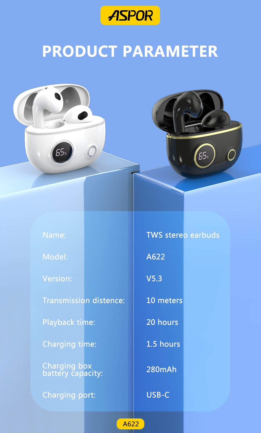 产品简介:Model:A622 版本:V5.3 传输距离:10M 播放时间:20hours 充电时间:1.5hours 充电盒电池容量:280mAh 充电端口:USB-C