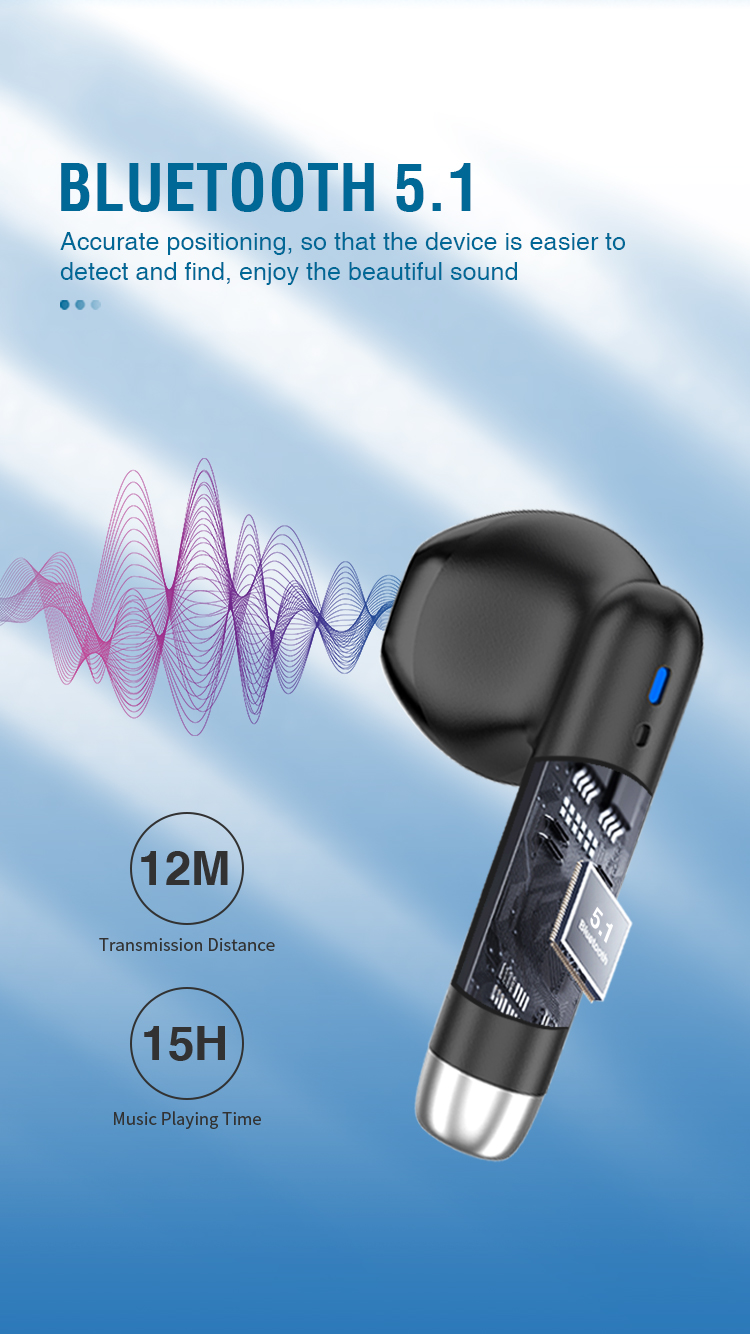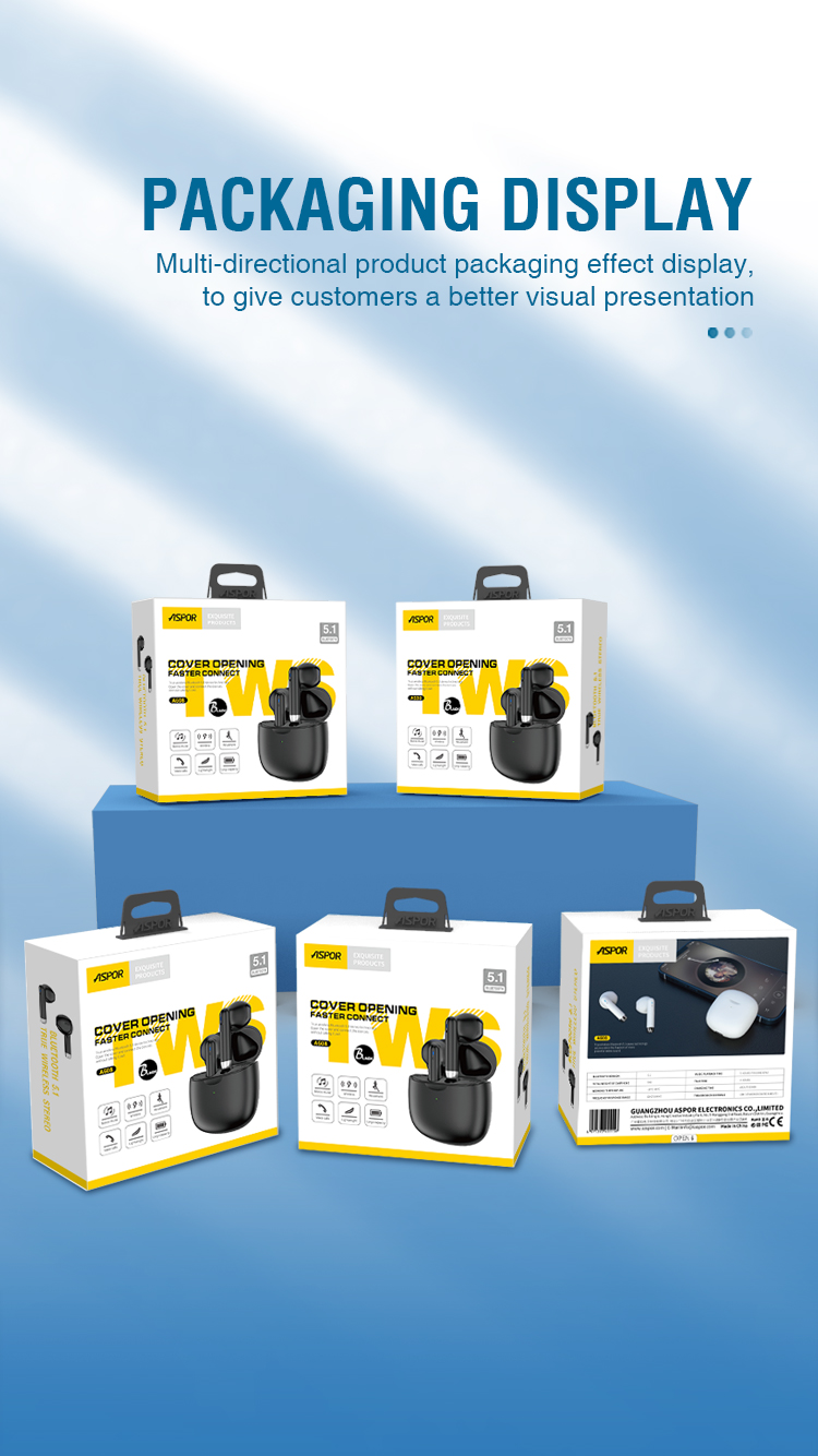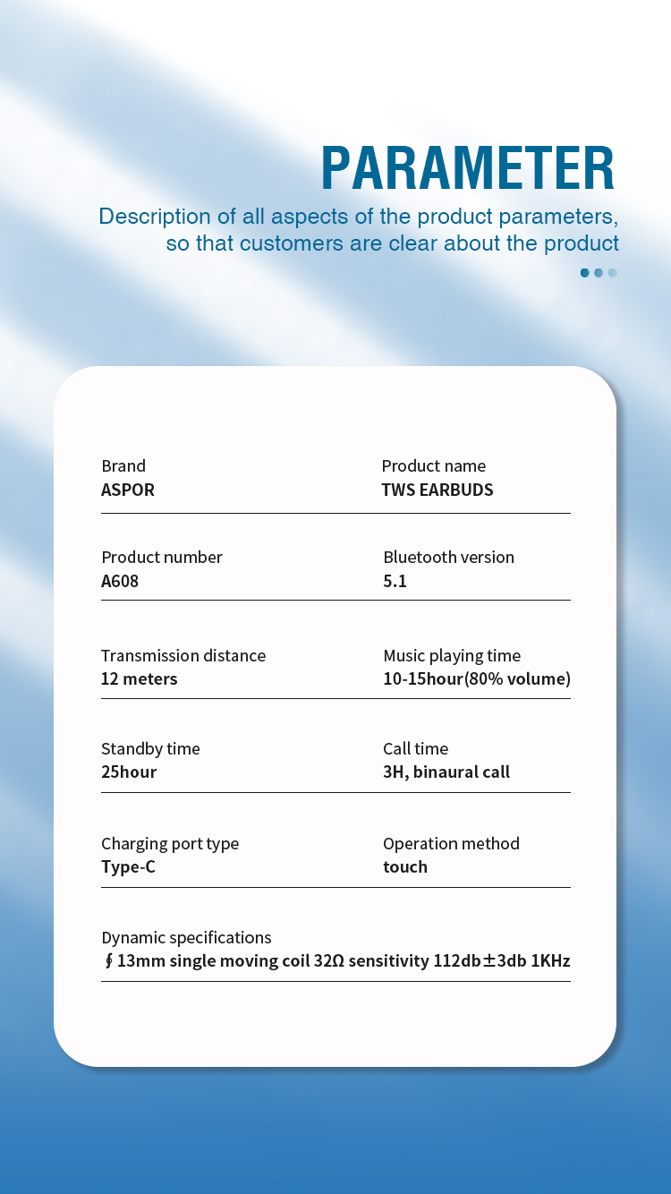 产品简介:Model: A608 蓝牙版本:V5.1 传输距离:12M 播放时间:10-15hours 待机时间:25hours 通话时间:3 hours(双耳呼叫) 充电端口:C型