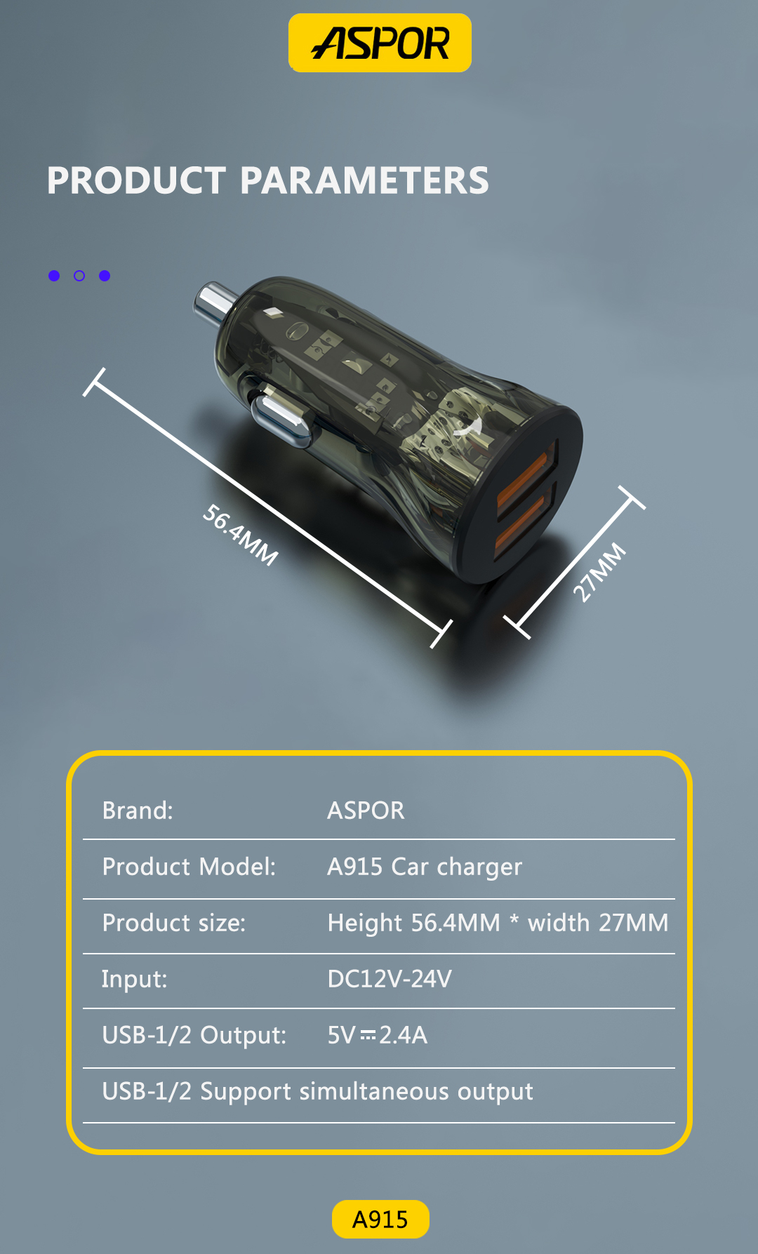 产品简介:Model: A915 尺寸:56.4x27MM 输入:DC12V-24V USB-1/2 输出:5V=2.4A USB-1/2 支持同时输出