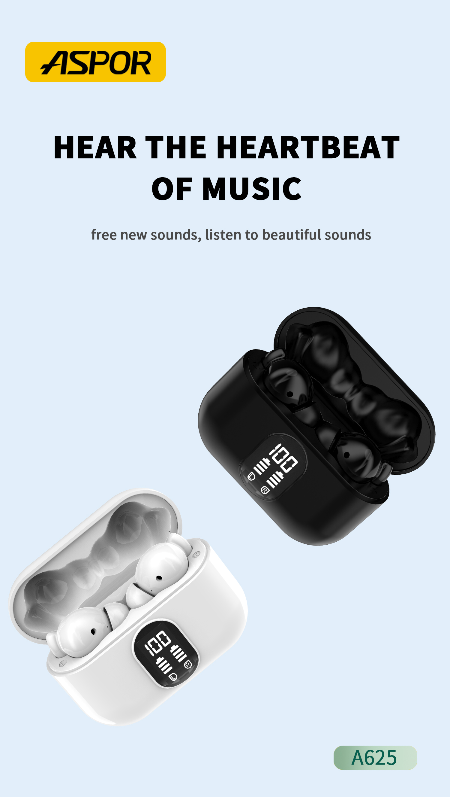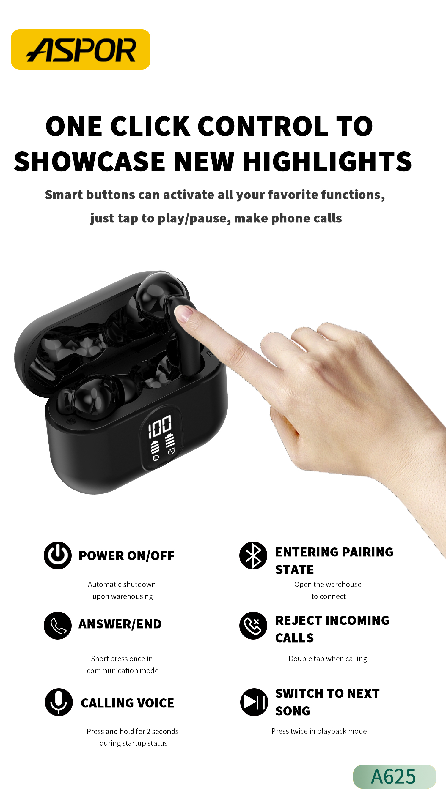 产品简介:Model:A625 最大功率:5MW 蓝牙范围:10M 演讲时间:4 hours 音乐时间:5 hours 充电盒电池容量:300mAh