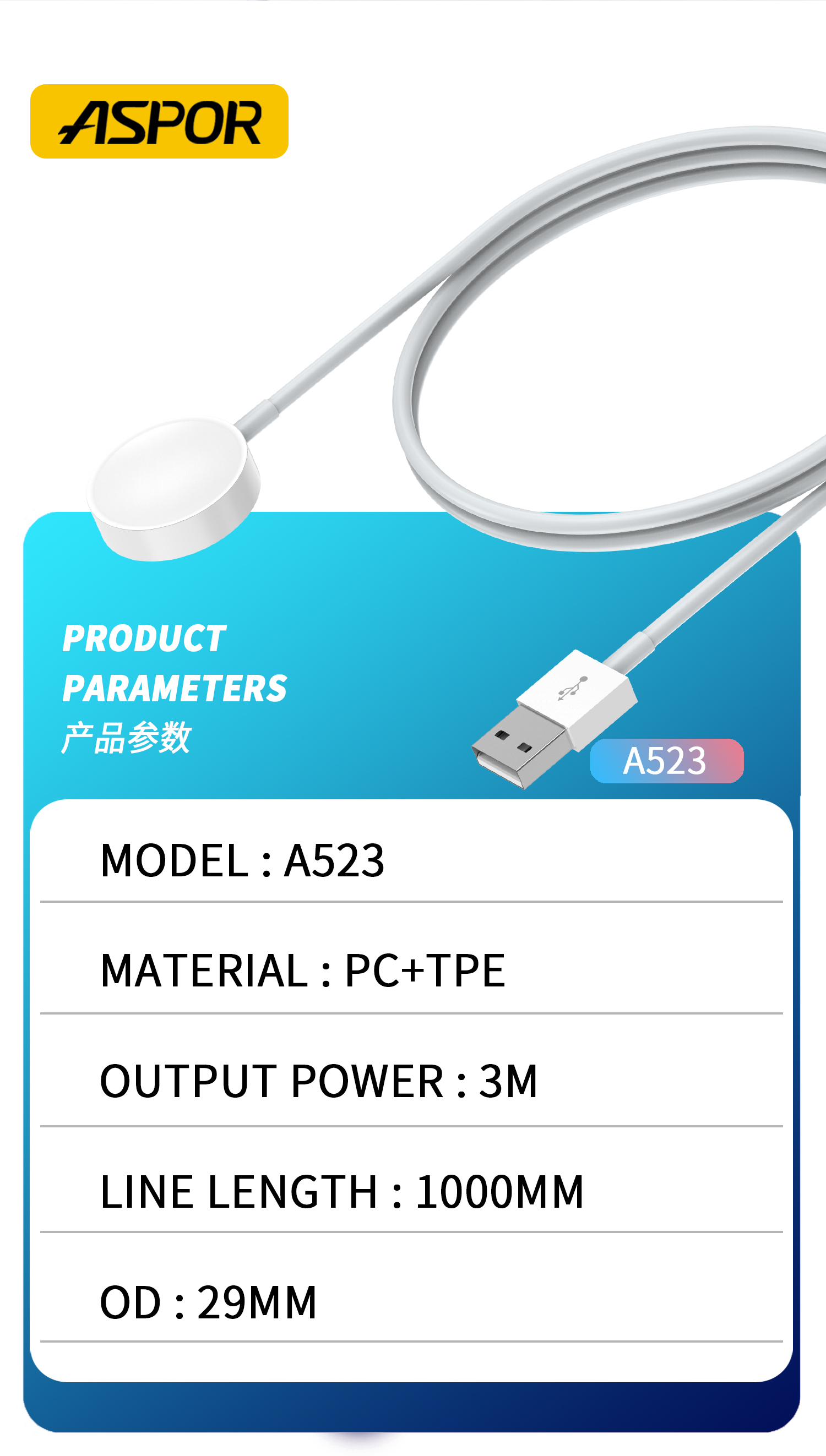 产品简介:Model:A523 材料:PC+TPE 输出功率:3M 线长:1000MM 外径:29MM
