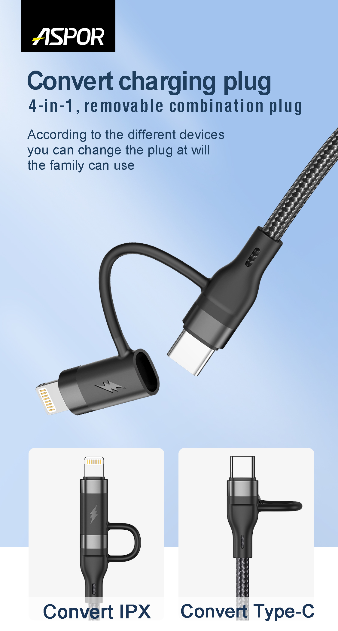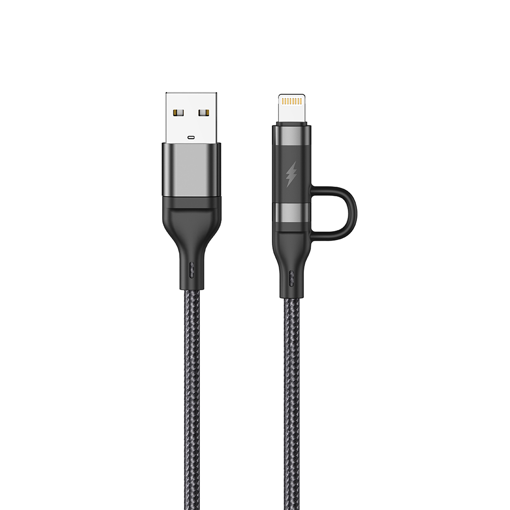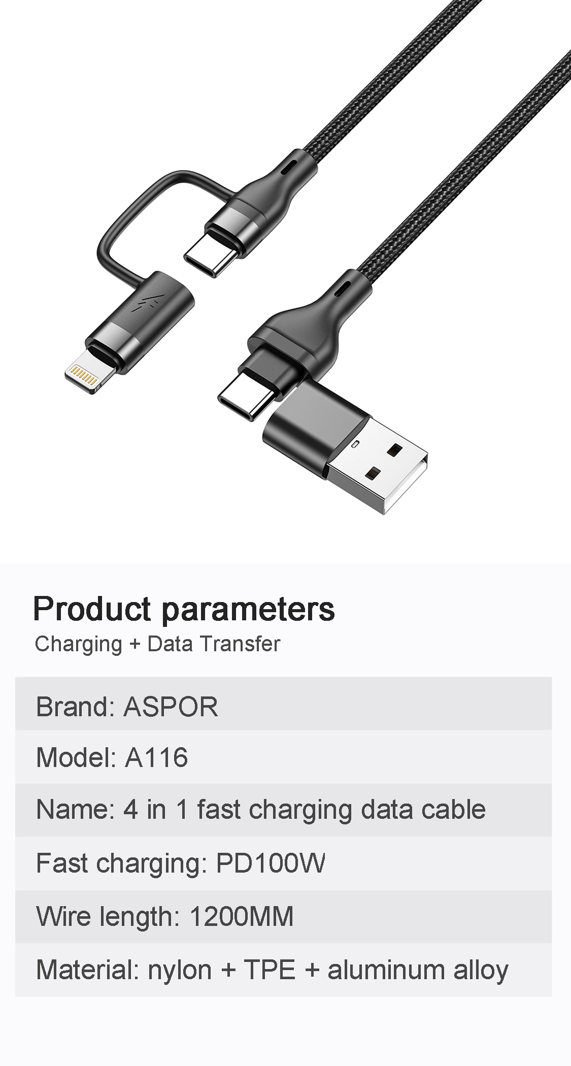 产品简介:Model: A116 Name: 4 in 1 fast charging data cable Fasr charging: PD 100W Wire length: 1200MM Material: nylon + TPE + aluminum alloy