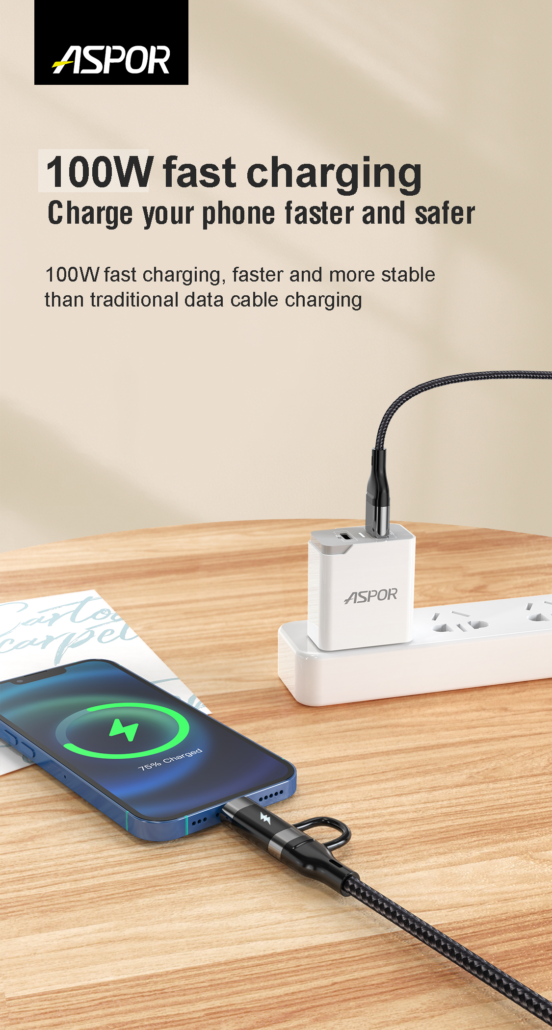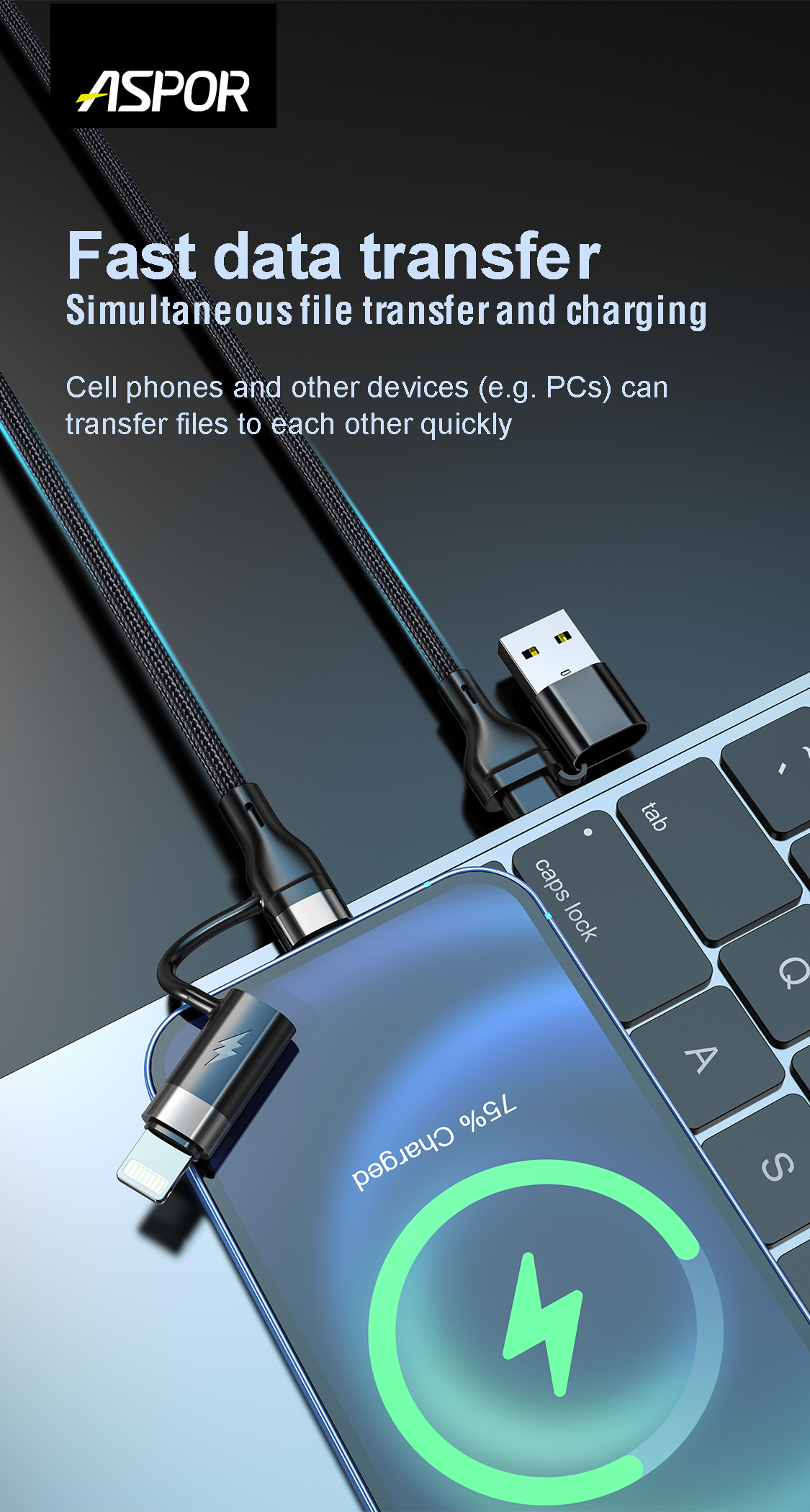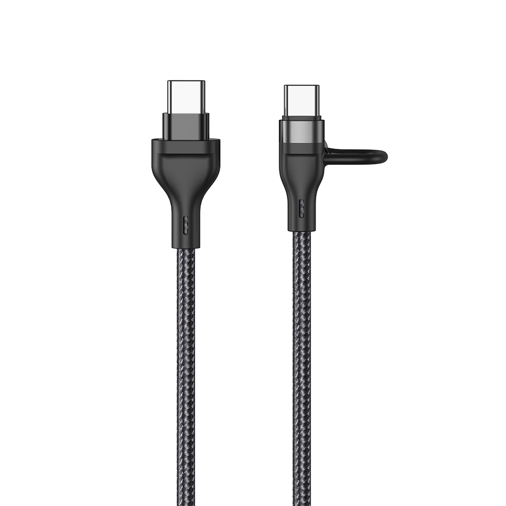 产品简介:Model: A116 Name: 4 in 1 fast charging data cable Fasr charging: PD 100W Wire length: 1200MM Material: nylon + TPE + aluminum alloy