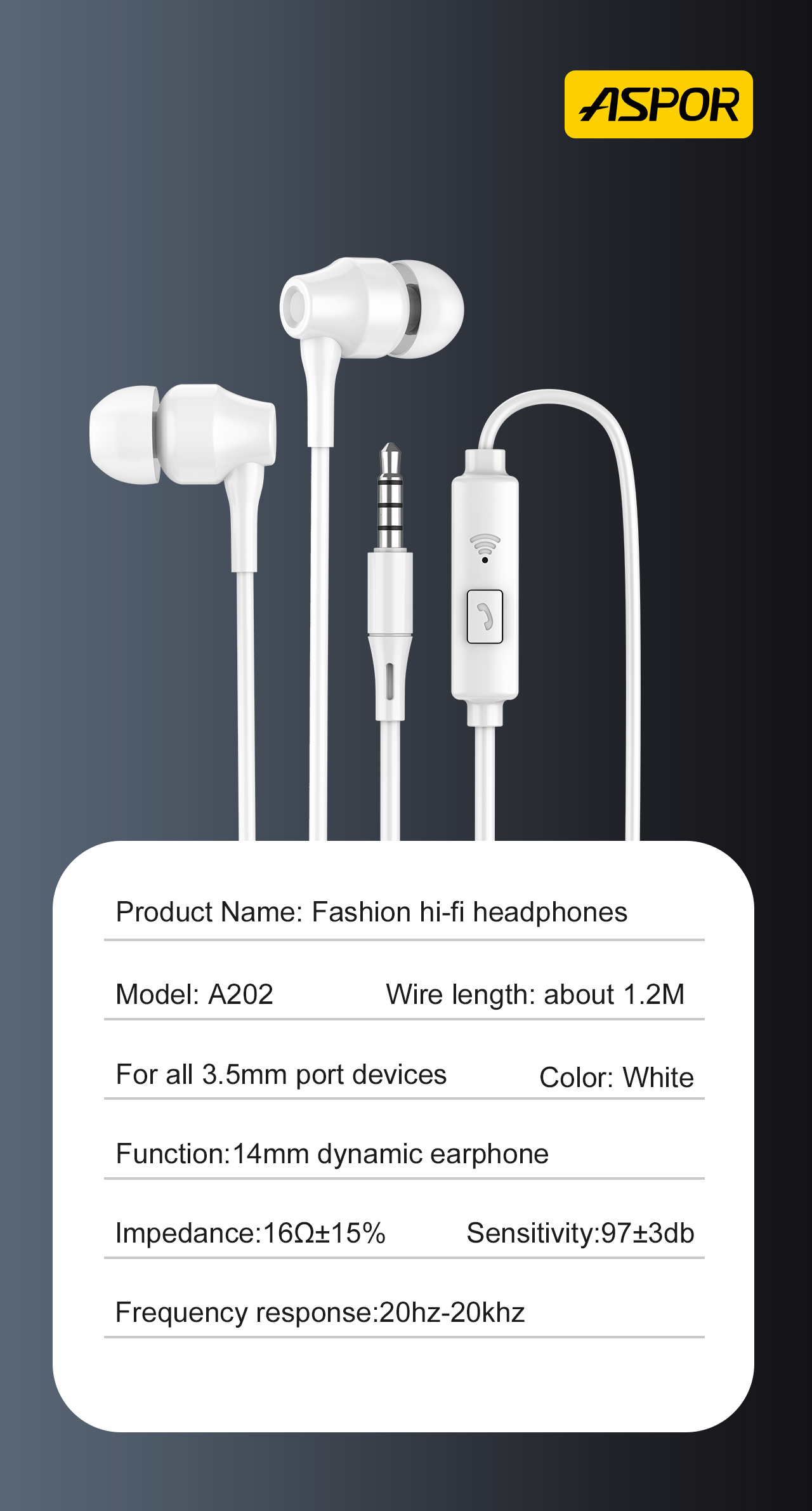 产品简介:Model:A202 Wire length: about 1.2M For all 3.5mm port devices Color: White Function: 14mm dynamic earphone Frequency response:20hz-20khz