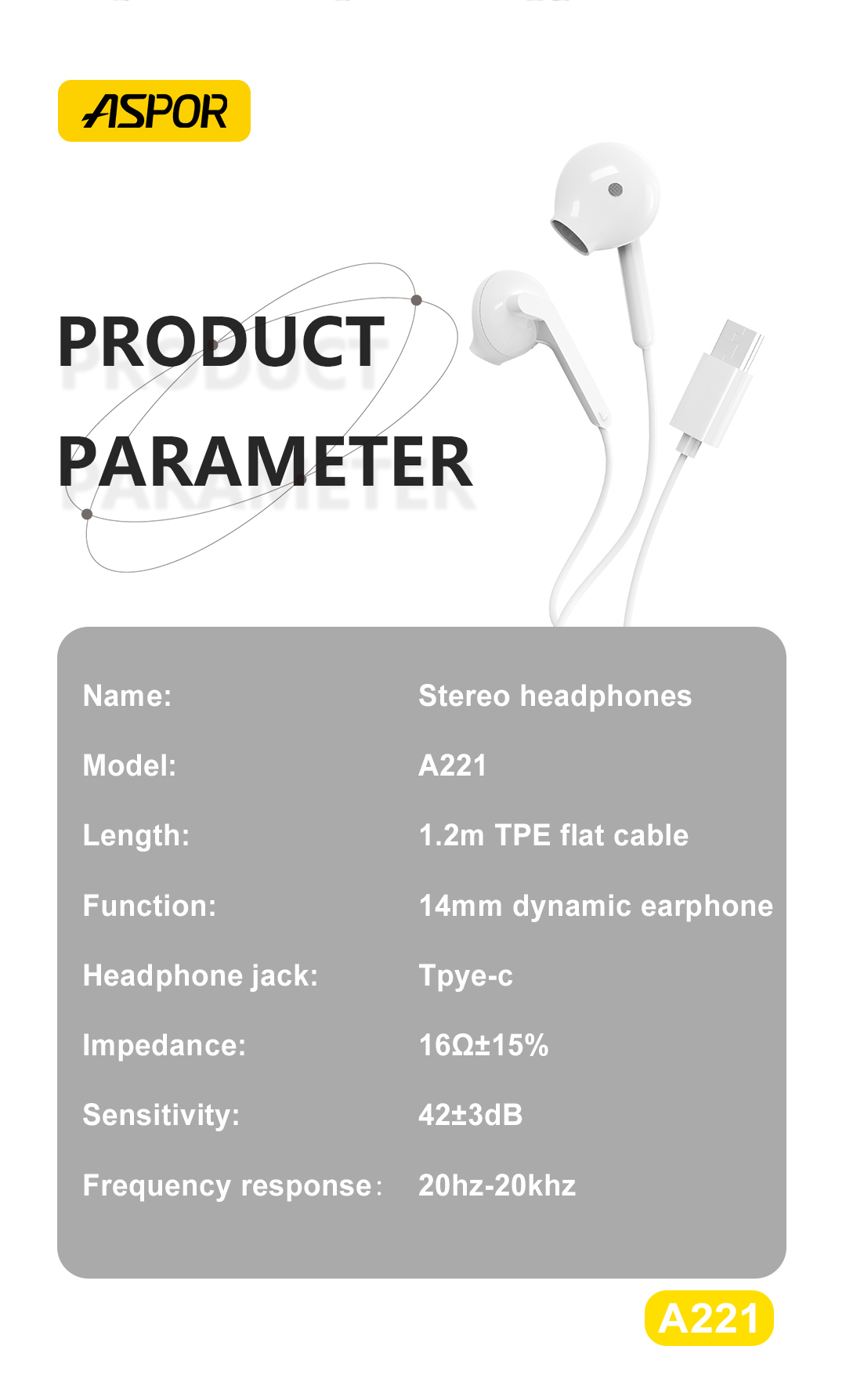 产品简介:Model:A221 Length: 1.2m TPE flat cable Function: 14mm dynamic earphone Headphone jack: Type-c Impedance: 16Ω±15% Sensitivity:42±3dB Frequency response: 20hz-20khz