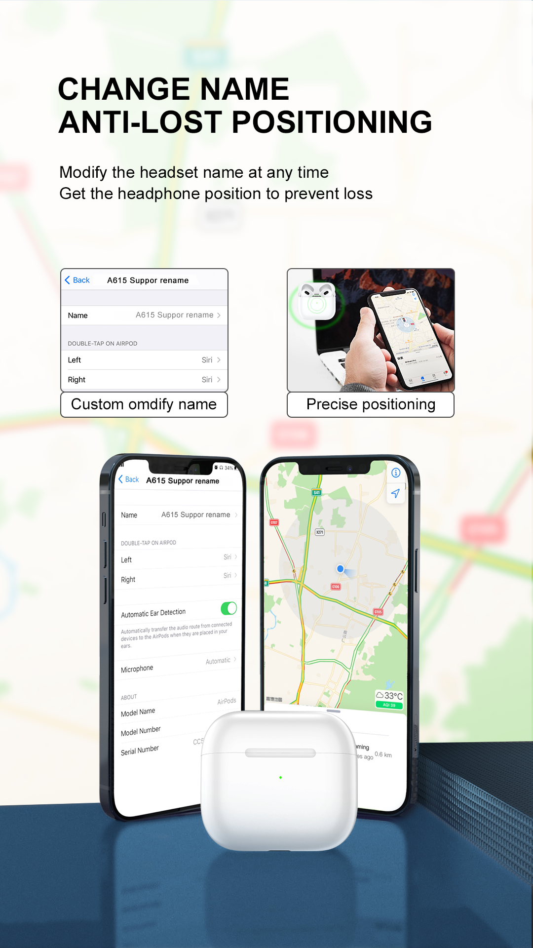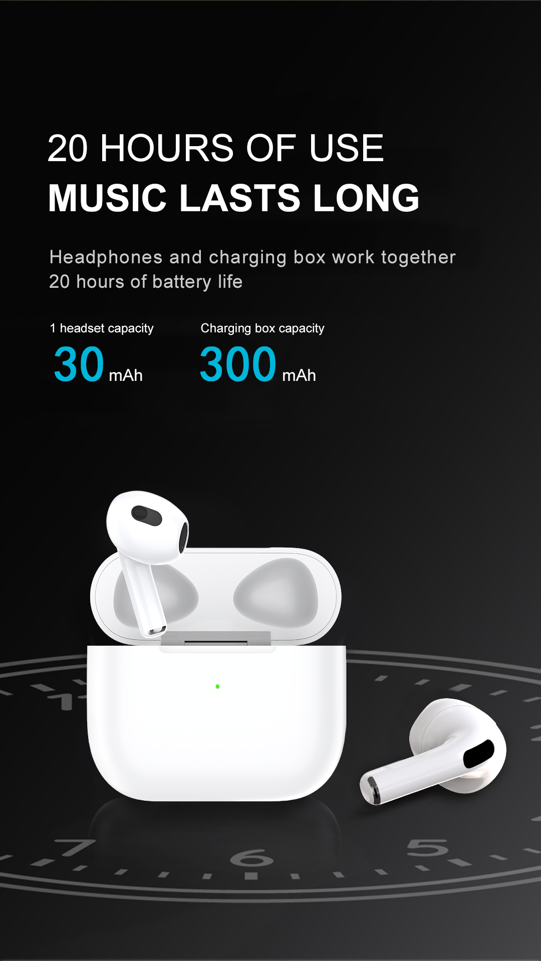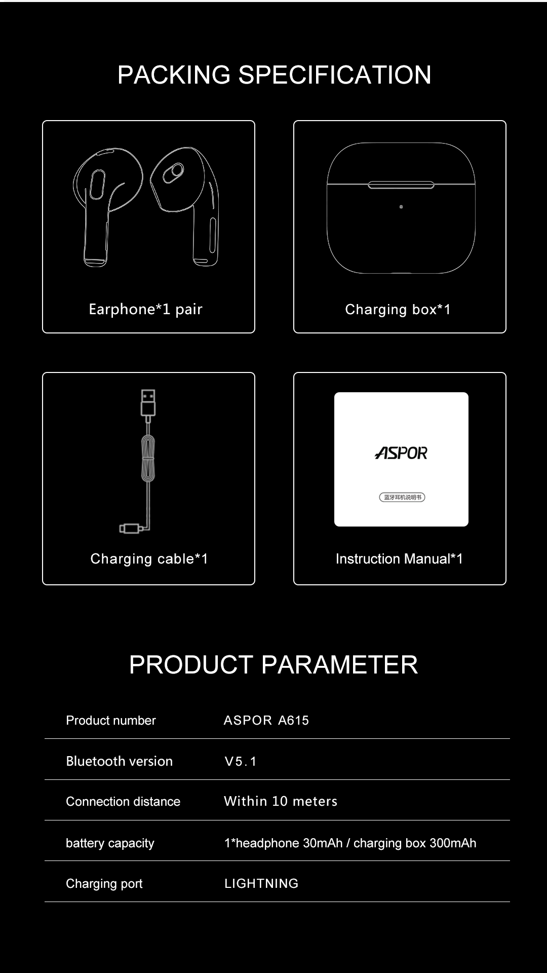 产品简介:Model:A615 Bluetooth version:V5.1 Connection distance: Within 10 metes Battery capacity: 1*headphone 30mAh / charging box 300mAh Charging port : LIGHTNING