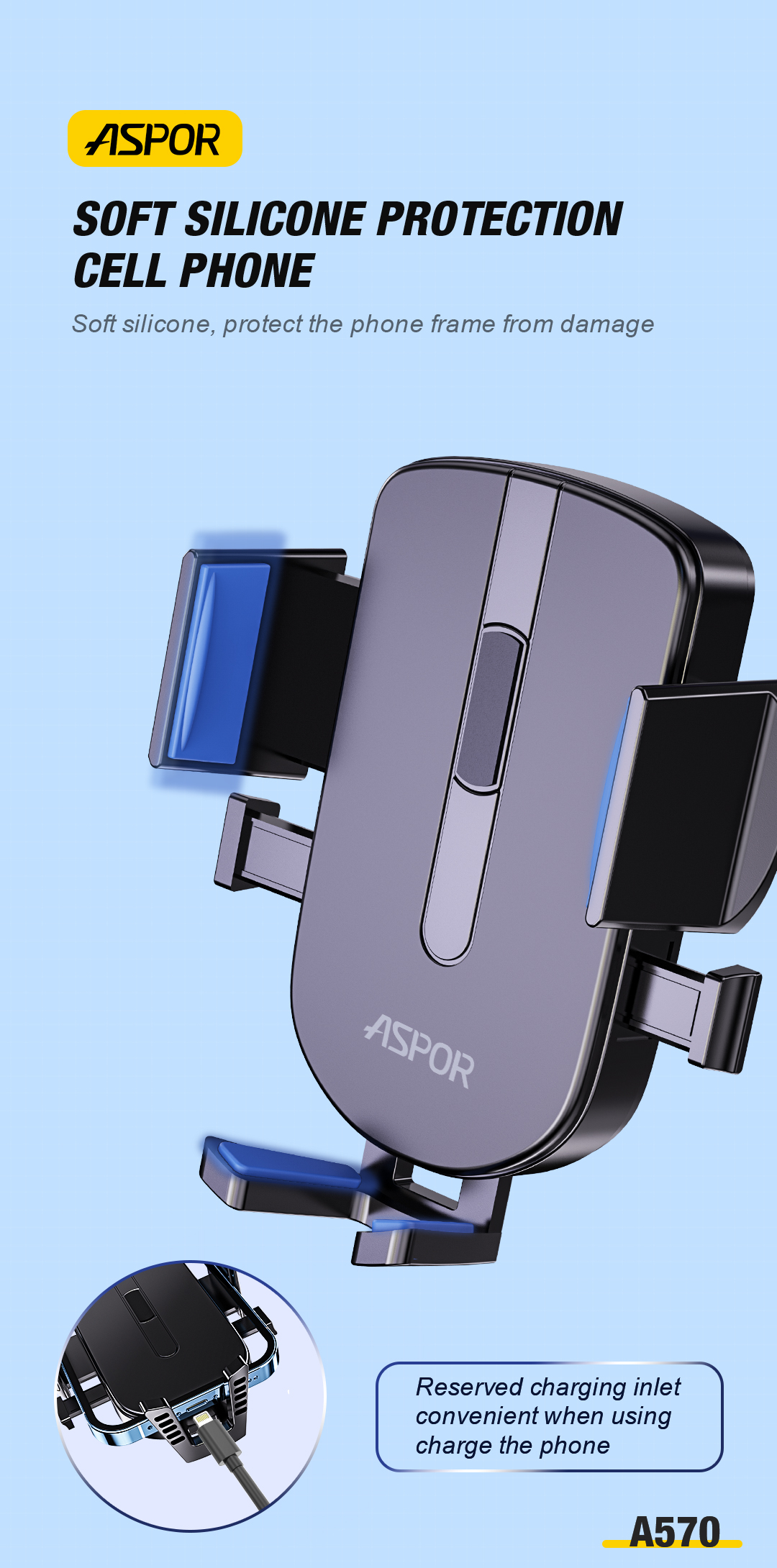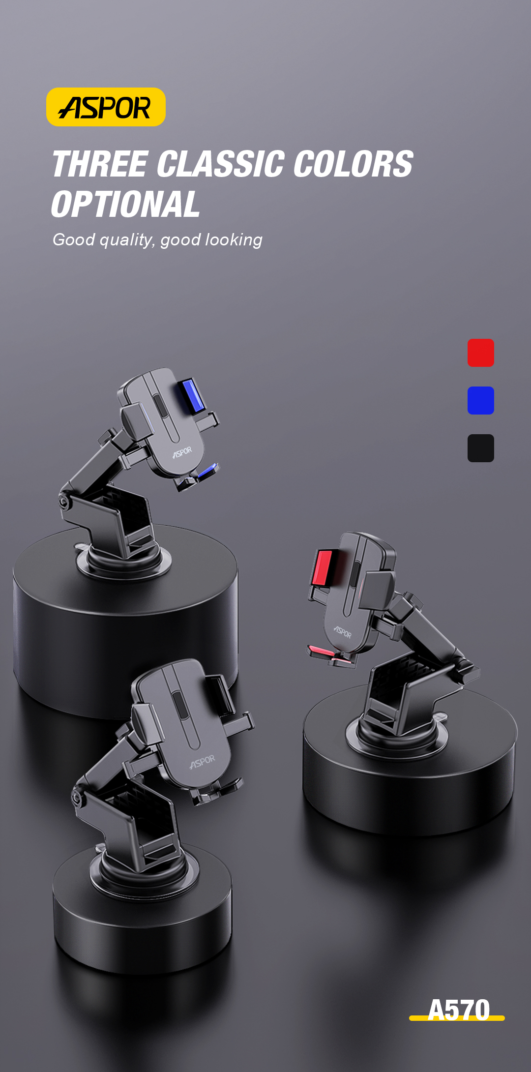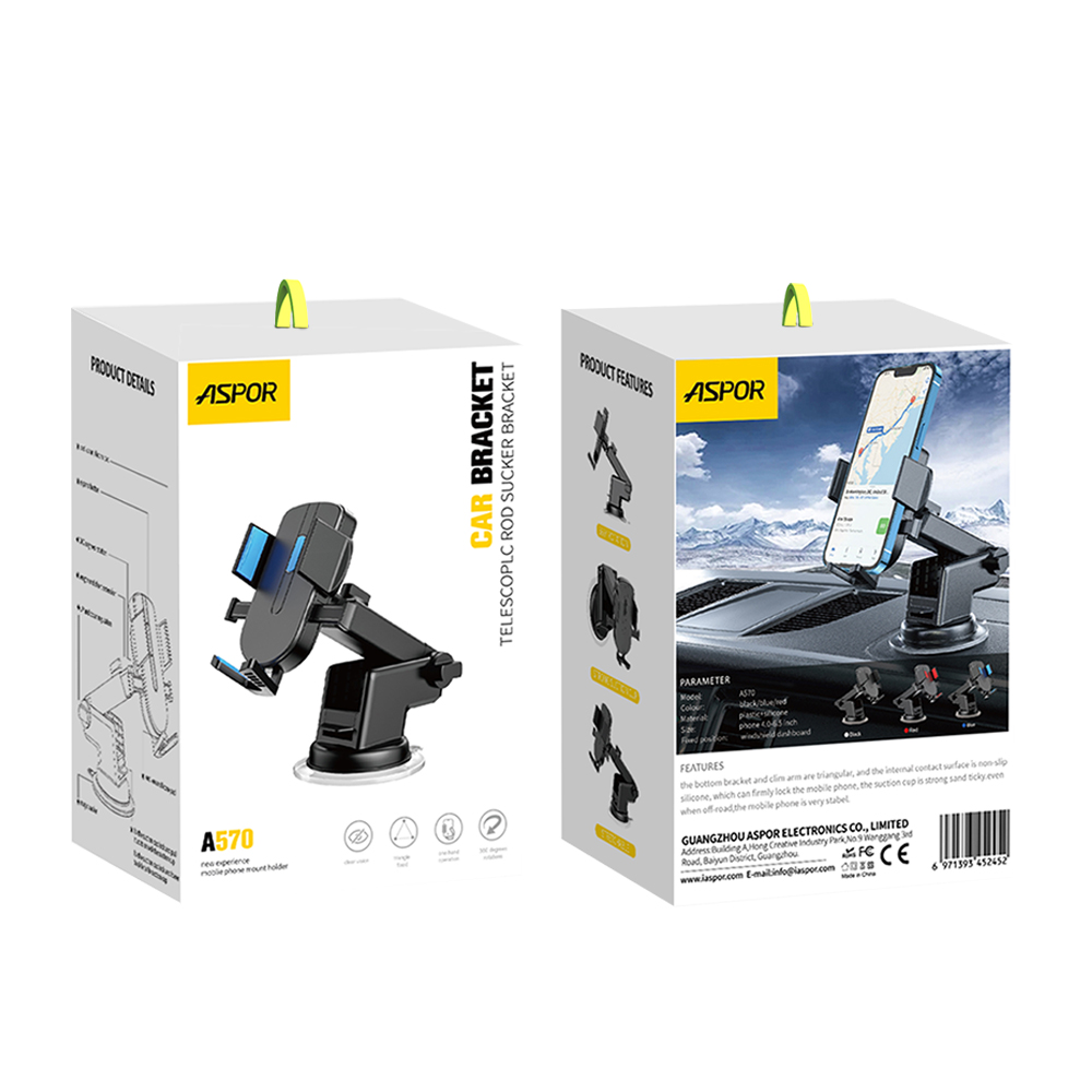 产品简介:Model: A570 Color: Black/Blue/Red Material: Plastic+Silicone Material Contain: Car Bracket+Gravity base