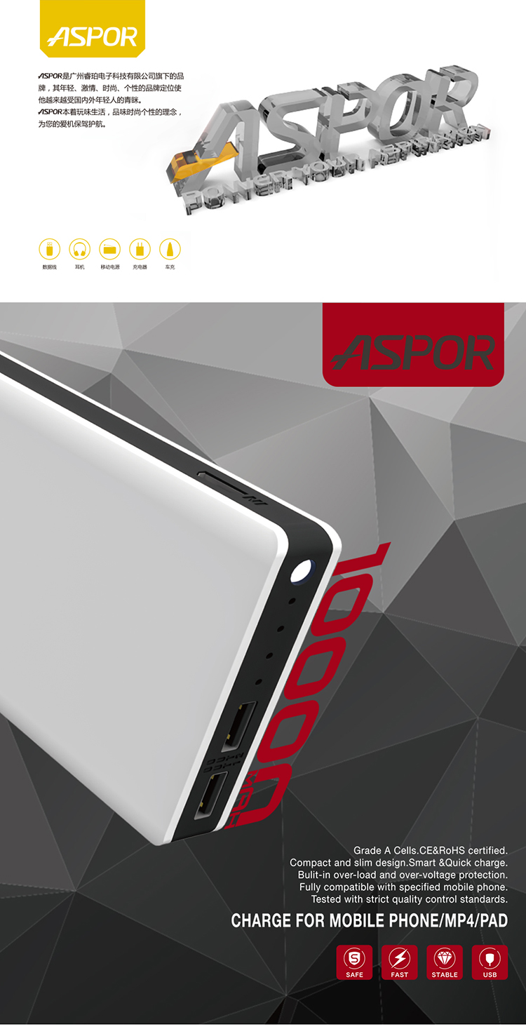 Product introduction:Model:A341 Capacity:10000mAh/37Wh Input:DC 5V-2.0A OVP Output :Total DC 5V-2.4A